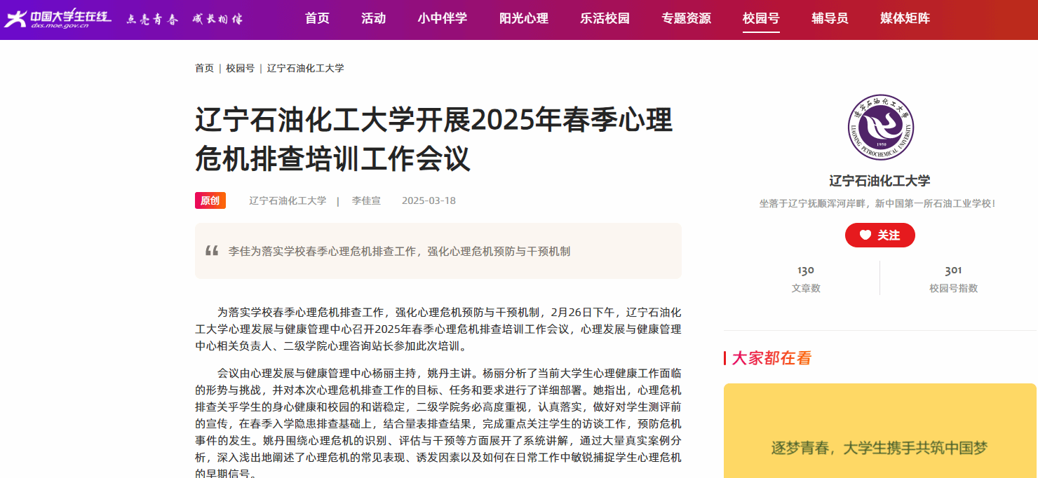 编者按:为落实学校春季心理危机排查工作,强化心理危机预防与干预机制,心理发展与健康管理中心召开2025年春季心理危机排查培训工作会议,心理发展与健康管理中心相关负责人、二级学院心理咨询站长参加此次培训。教育部中国大学生在线网对此文进行了宣传。现将相关报道转载如下: